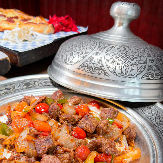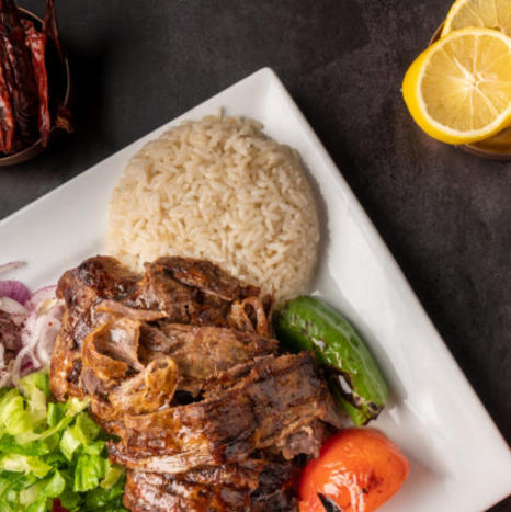 Served with rice or bulgur, bread, salad, grilled tomatoes, and red peppers.